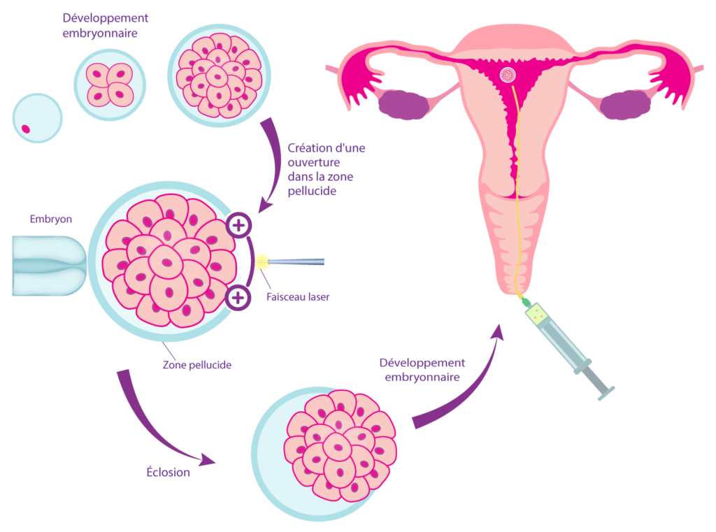 L’éclosion assistée est une procédure qui consiste à faire un trou dans la coquille de l’embryon en développement pour faciliter le processus naturel d’éclosion. Cette opération est généralement effectuée le jour 3 suivant la collecte des ovocytes, généralement à l’aide d’un faisceau laser très précis. Dans les cas où le transfert d’embryon est effectué au stade blastocyste, l’éclosion assistée sera effectuée le jour 3, suivie d’une culture prolongée durant laquelle l'embryon est continuellement surveillé pour s'assurer d'un développement correct. Les embryons peuvent également subir l’éclosion assistée lorsqu’ils sont décongelés pour un transfert d’embryon congelé si l’éclosion assistée n’a pas été effectuée avant la congélation.