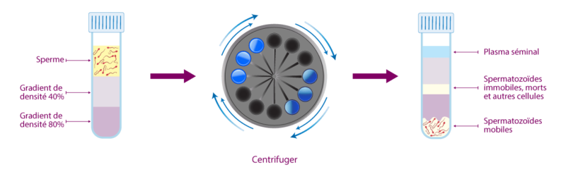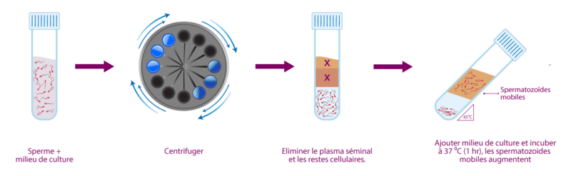 - Swim-Up: L'échantillon est lavé avec un milieu spécifique pour éliminer le plasma séminal et les spermatozoïdes sont centrifugés au fond de l'éprouvette afin que les spermatozoïdes à forte mobilité remontent à la surface.